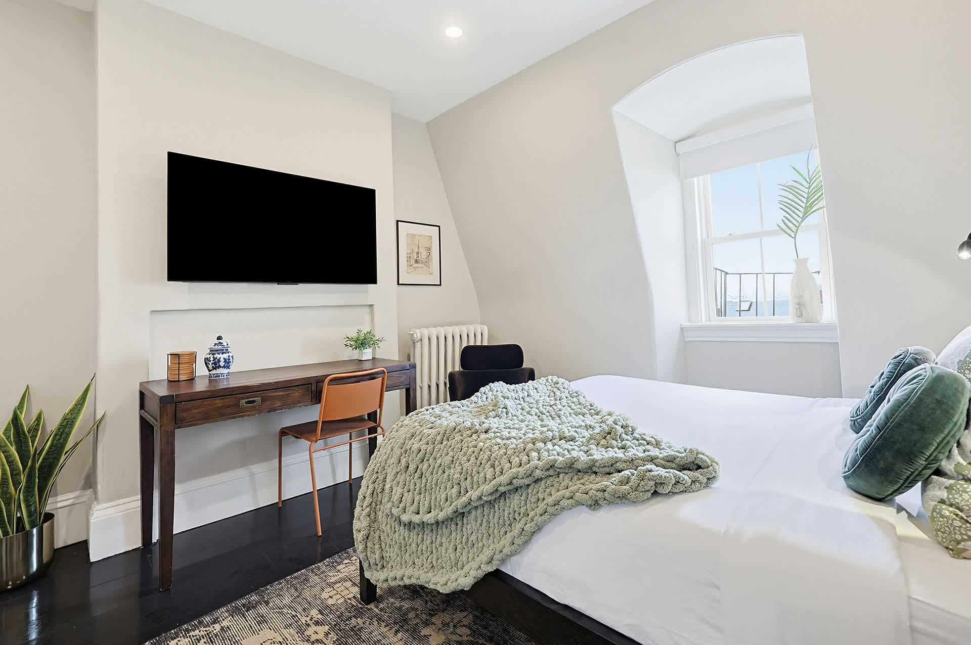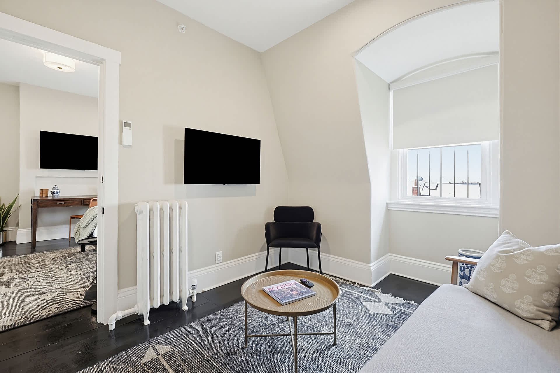Discover The Chester, A Boutique Stay in the heart of the South End. Combining modern with classic charm, this one-bedroom suite sleeps up to four guests with a queen bed and queen layflat couch. Enjoy the sleek kitchenette with a mini-fridge, microwave, sink, and induction cooktop. The bathroom features classic tile and a glass-enclosed stand-up shower. Bay windows offer stunning Back Bay views, and the expertly curated decor adds a stylish touch. Book this unique Boston experience today!