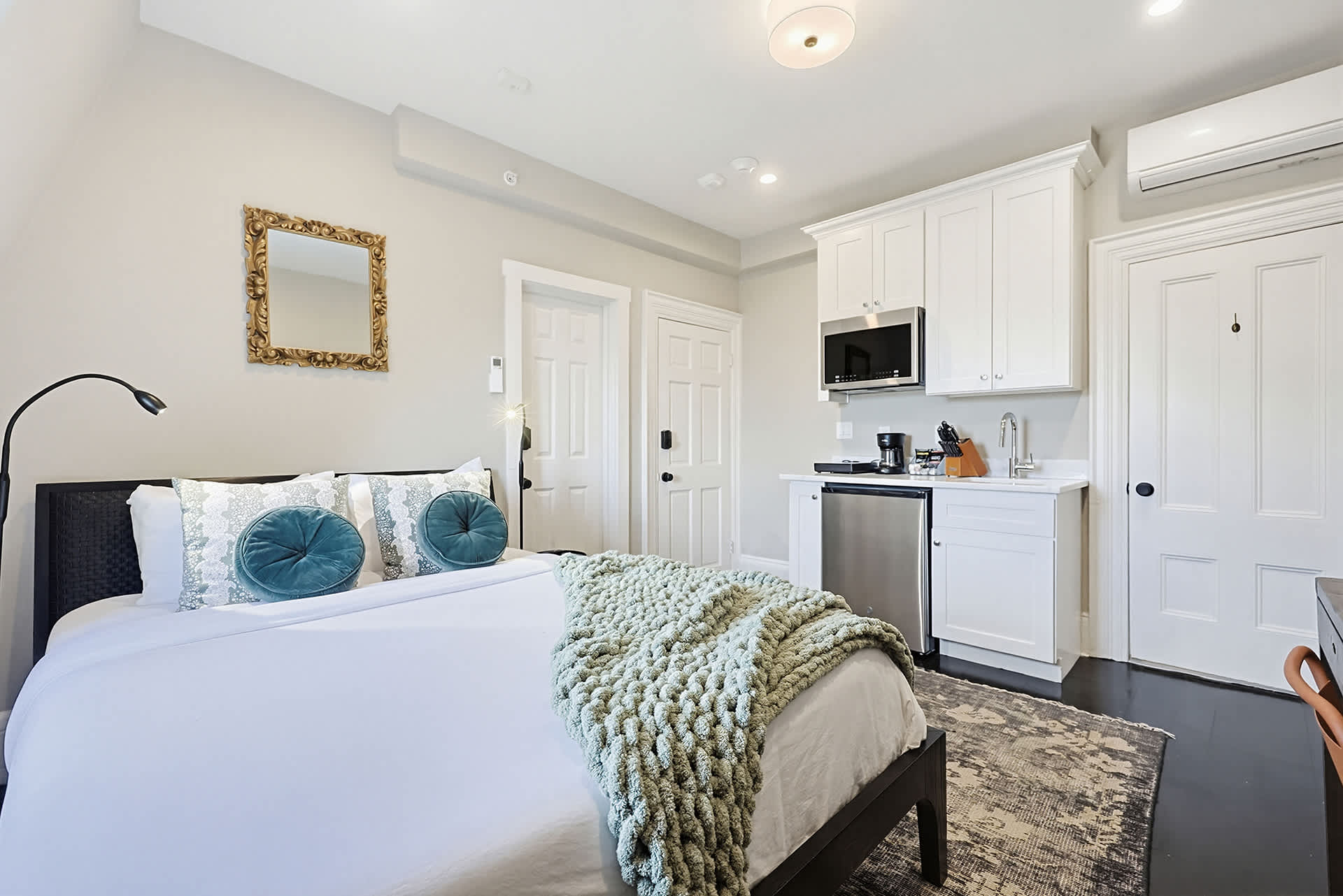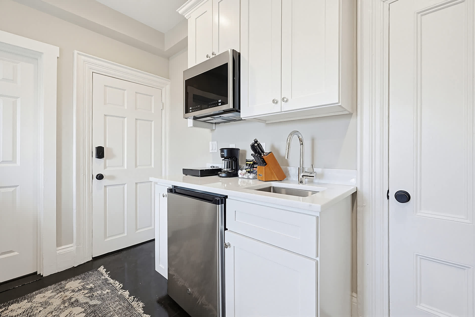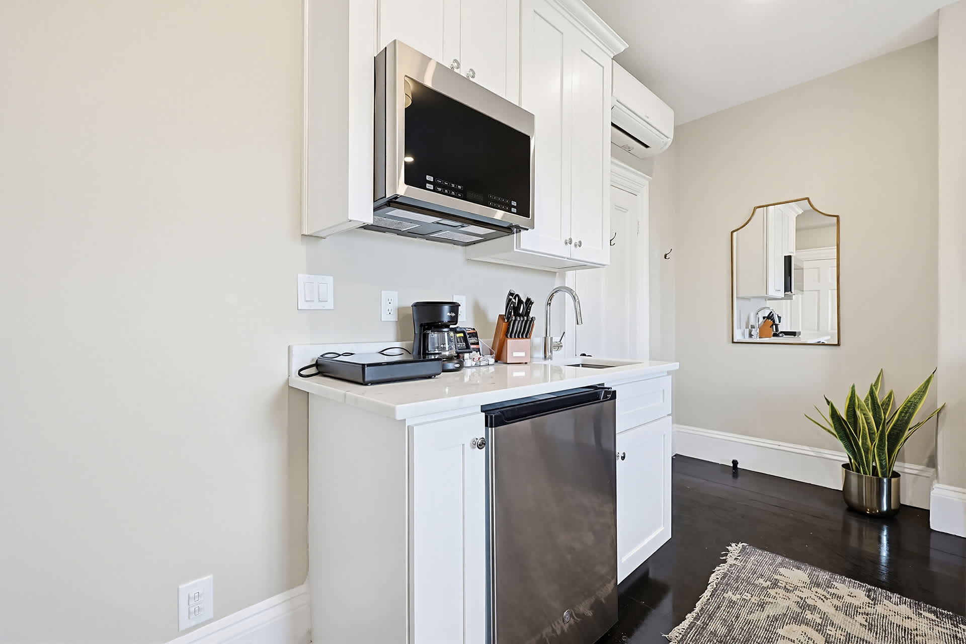 The kitchenette beckons with its sleek design and practical amenities, including a mini-fridge, microwave, sink, single burner induction cooktop, and drip coffee pot, catering to your culinary needs.