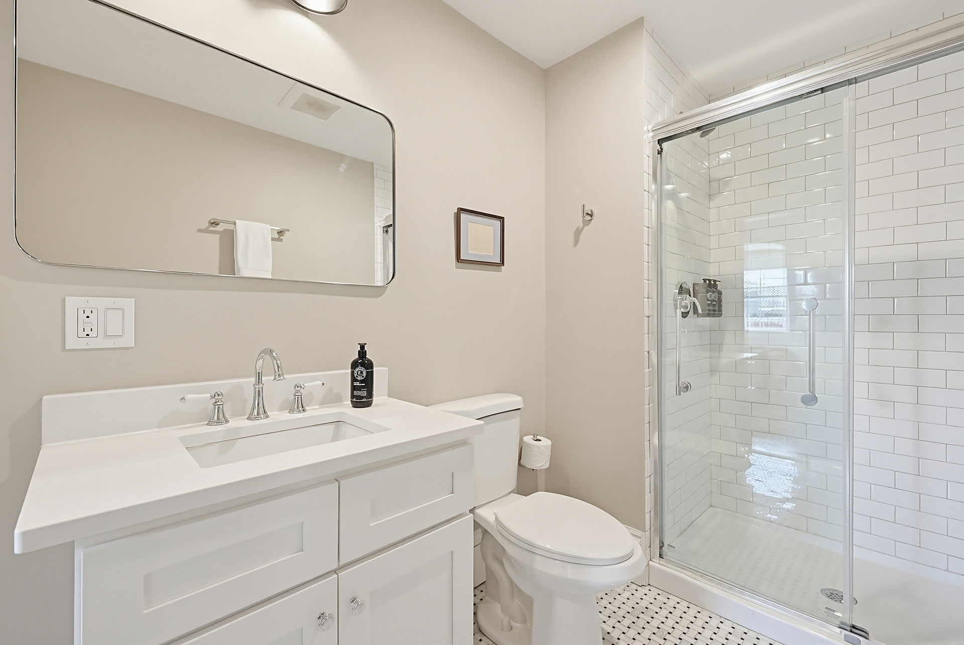 Refresh and rejuvenate in the bathroom featuring classic tile and a glass-enclosed stand-up shower, adding a touch of luxury to your stay.